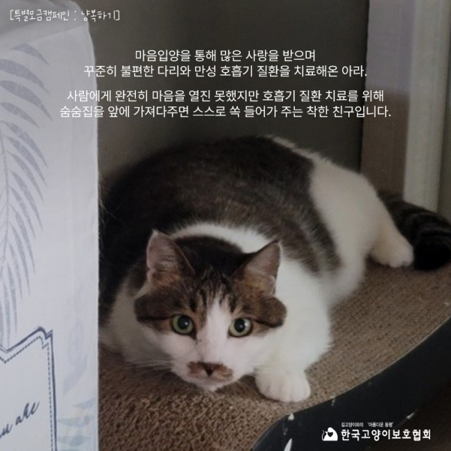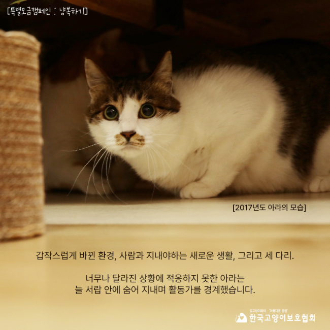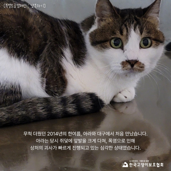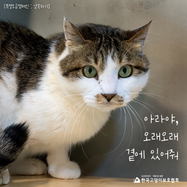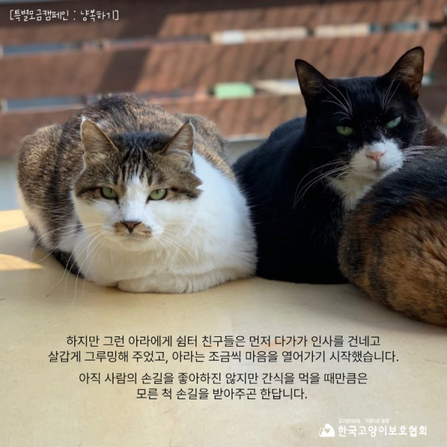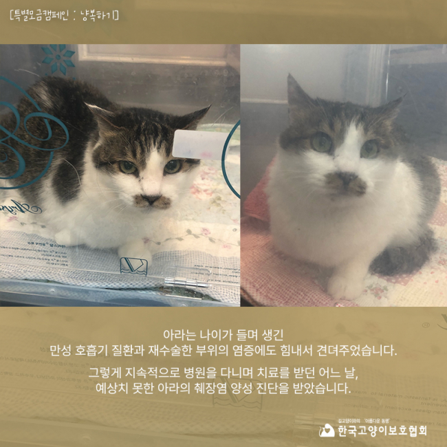 보태주신 마음은 아라가 보살핌 받고 있는 한국고양이보호협회에서 관리합니다. 링크를 통해 모이는 모금은 모두 아라에게만 사용됩니다.