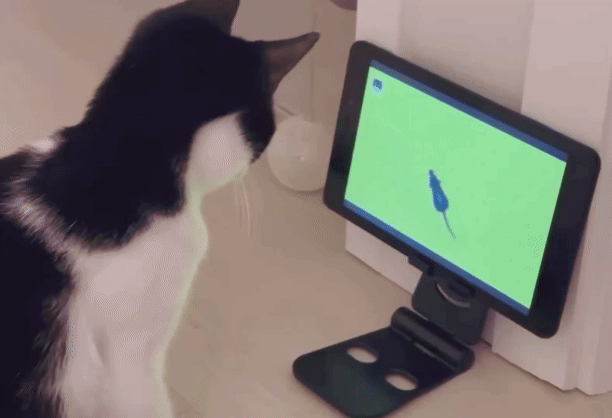 화면에 나오는 쥐가 신기한지 마구 잡으려 한다