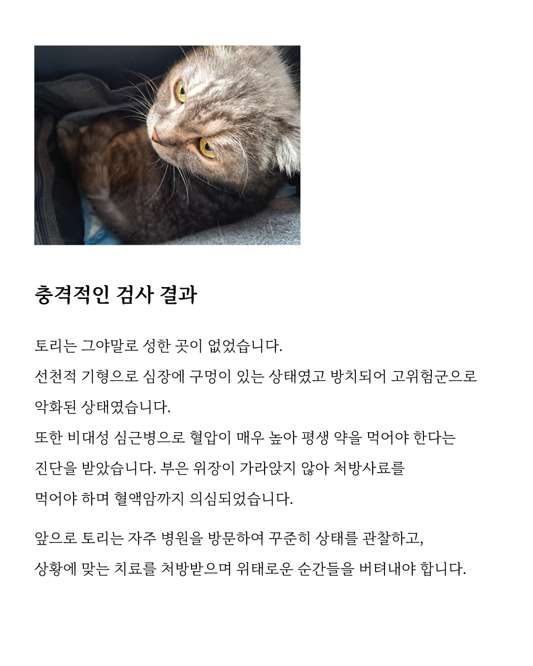 보태주신 마음은 토리가 보살핌 받고 있는 한국고양이보호협회에서 관리합니다. 링크를 통해 모이는 모금은 모두 토리에게만 사용됩니다.
